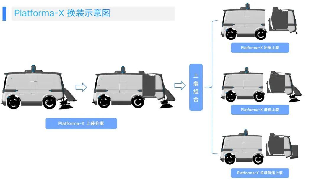 以环卫行业为例,传统模式下“1人1车”的作业方式不仅人力成本高,还存在安全隐患和效率低下等问题。基于行业痛点和深厚的L4级无人驾驶技术积累,仙途智能深度实践了自动驾驶技术重构传统产业的可行性路径,例如,仙途智能全栈自研了业内首款“一车多用”无人驾驶车Platforma-X,通过“1个底盘+3个上装”的创新产品形态,开创性地实现了全流程无人化、一体化自主作业。
