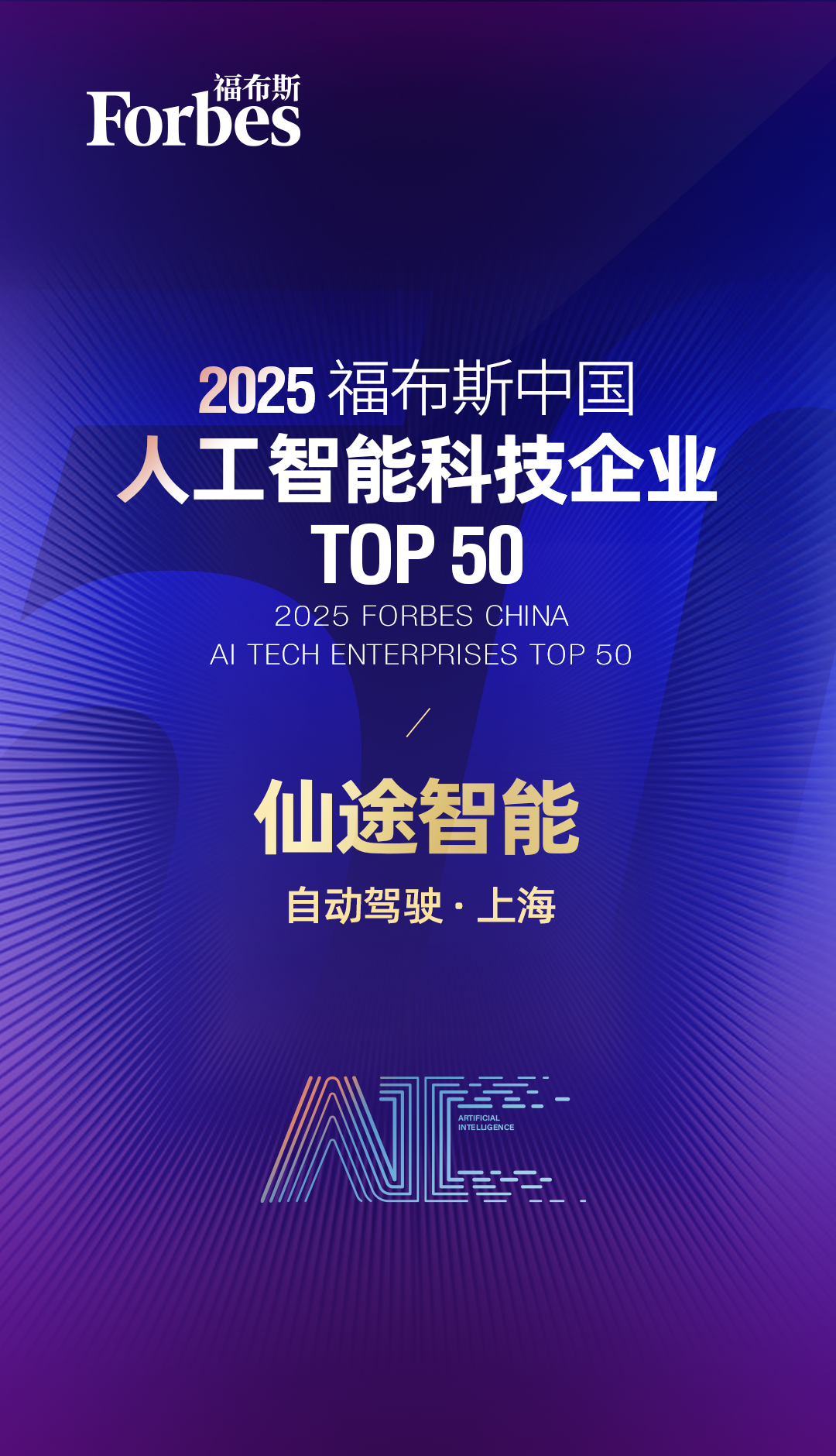 5月11日,福布斯中国正式发布“2025福布斯中国人工智能科技企业TOP50”,仙途智能凭借在人工智能领域的创新能力、关键技术突破及良好的市场表现,与阿里云、DeepSeek、宇树科技、火山引擎等企业共同跻身主榜单。这一权威榜单的发布,不仅是对中国人工智能领域蓬勃发展的生动注脚,更是对仙途智能在人工智能与无人驾驶商业化领域的高度认可。